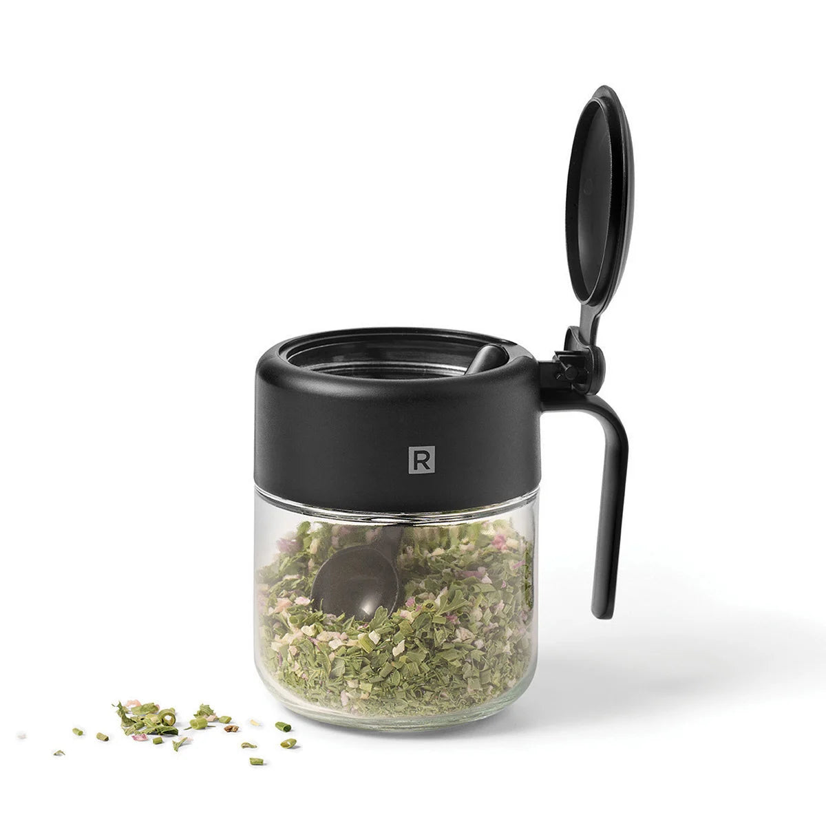 Add a touch of style and functionality to your kitchen with the RICARDO condiment jar! Its clear glass design showcases your spices and seasonings, while the lid stays open for easy serving. It comes with a small spoon and is dishwasher safe for quick cleaning.