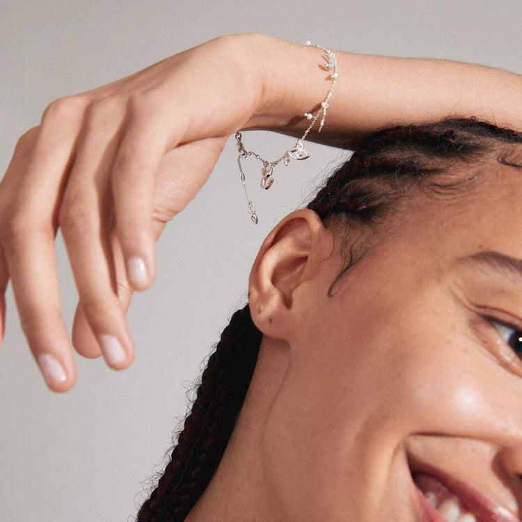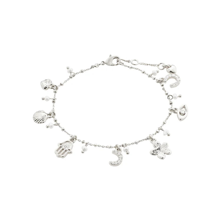 Embrace new adventures with the silver-plated PRUCENCE bracelet from Pilgrim. A romantic tangle of tiny charms spinning a tale of love, dreams and happiness. Every charm from heart to moon, horseshoe to Hamsa, seashell to the all-seeing eye, is a nod to the adventure of everyday life. The tiny freshwater pearl and sparkling Preciosa crystals give the bracelet a dreamy vibe, while the rich symbolism lifts your spirit and adds a personal touch. Created with passion from 90% recycled material, the PRUCENCE wristband is a choice that's good for both the heart and the planet.