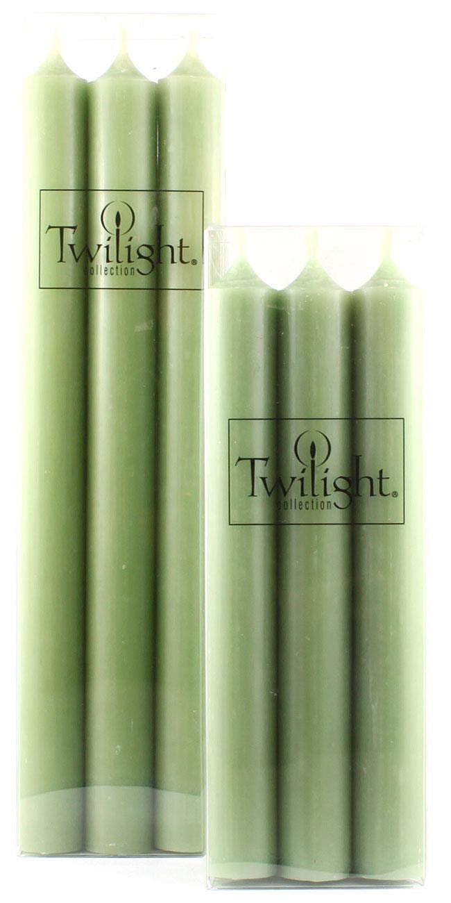 Twilight Collection 10” 6-pack - 6 solid coloured dinner candles in a clear plastic box, fragrance free. Burn approximately 1" per hour, smokeless and dripless. Made in Germany, these candles are drawn in the traditional European method using only the highest quality RAL-certified paraffin available and 100% lead-free cotton wicks.